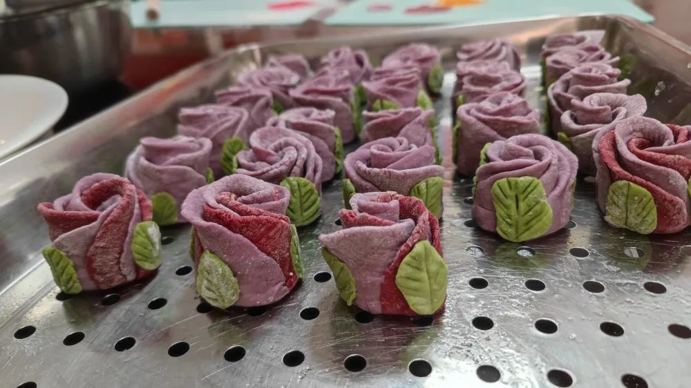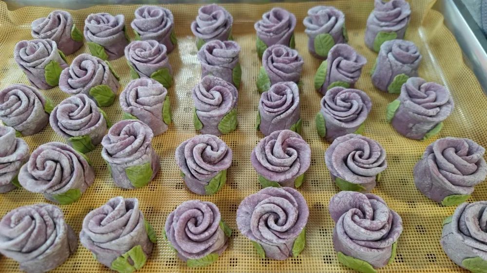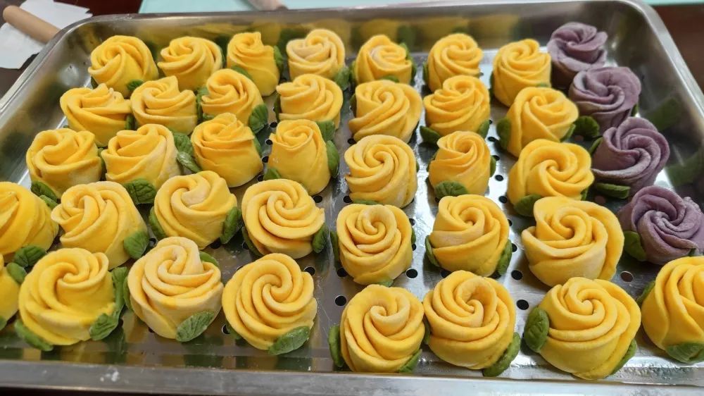 現場彌漫著一股綿密香甜的味道,新鮮的玫瑰花饅頭出鍋了!