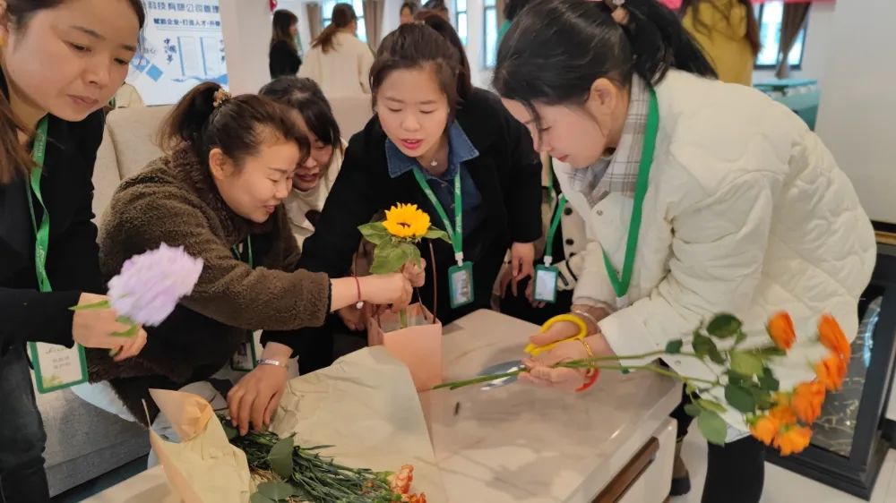 一枝枝小雛菊、向日葵等經過女同胞們的巧手修枝剪葉,巧妙的創意組合,勾勒出一籃籃錯落有致、色彩鮮艷的插花作品,寄托著女同胞們對美的理解和對幸福的感悟。